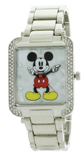 This Disney Time Works Mickey Mouse watch has a a rectangular case with tiny rhinestones embedded on right and left, a mother of pearl dial featuring Mickey, and the hour markers are stones as well. Mickey's arms are the watch hour and minute hands, his gloved hands pointing to the current time.