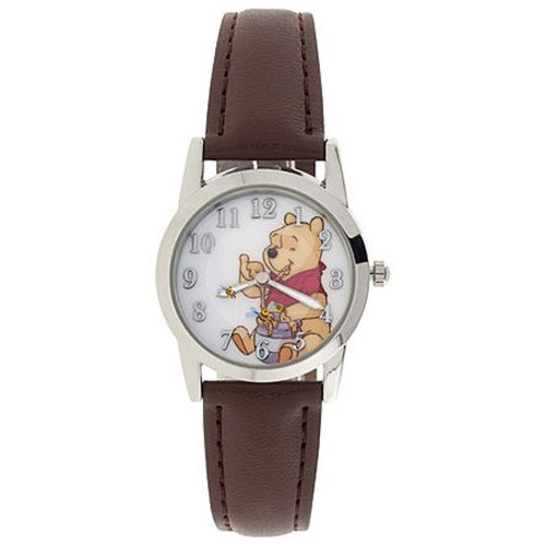 This Disney watch features Winnie the Pooh Watch sitting and enjoying honey, in front of a white dial with large numerals. The case is silver, and it has a dark brown strap.