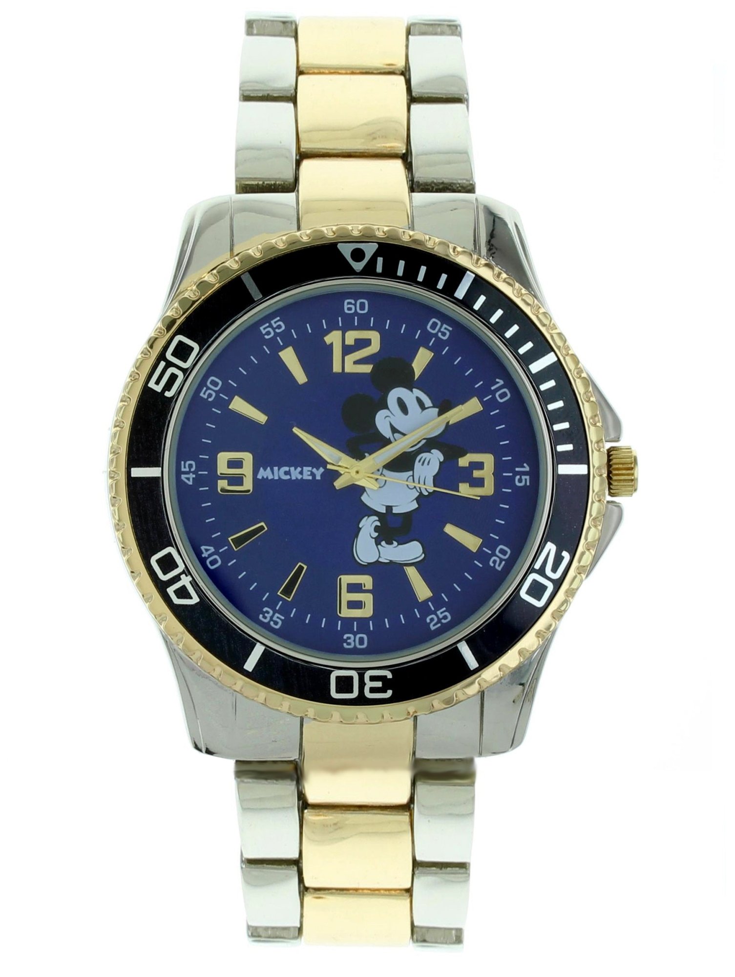 Men's Mickey Mouse Watch with Two Tone Metal Case and Strap with Black Bezel and Blue Dial